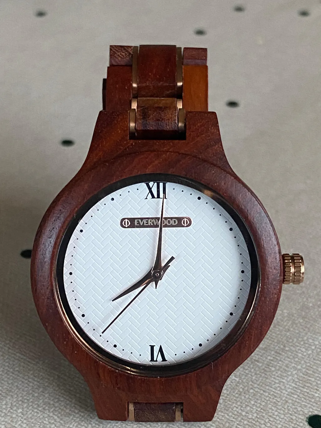 A fából készült karóra mérete a szíj néhány láncszemének eltávolításával állítható. A rendelt óra tartalmaz egy állító tűt, mellyel könnyedén beállíthatja a szíjat mindenki a csuklóméretéhez.
